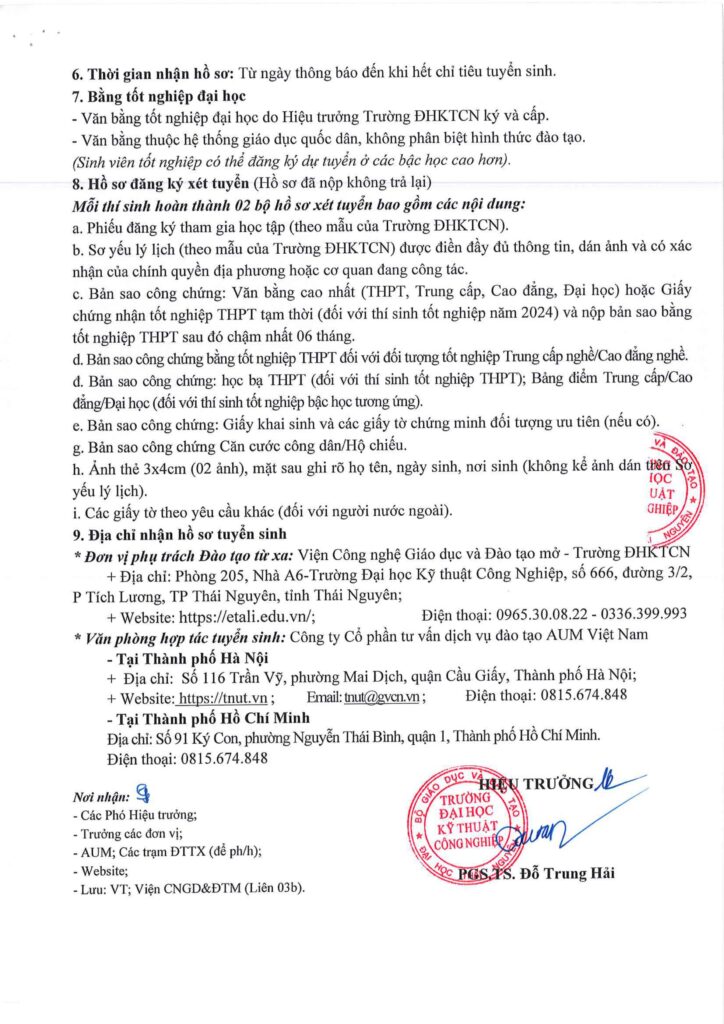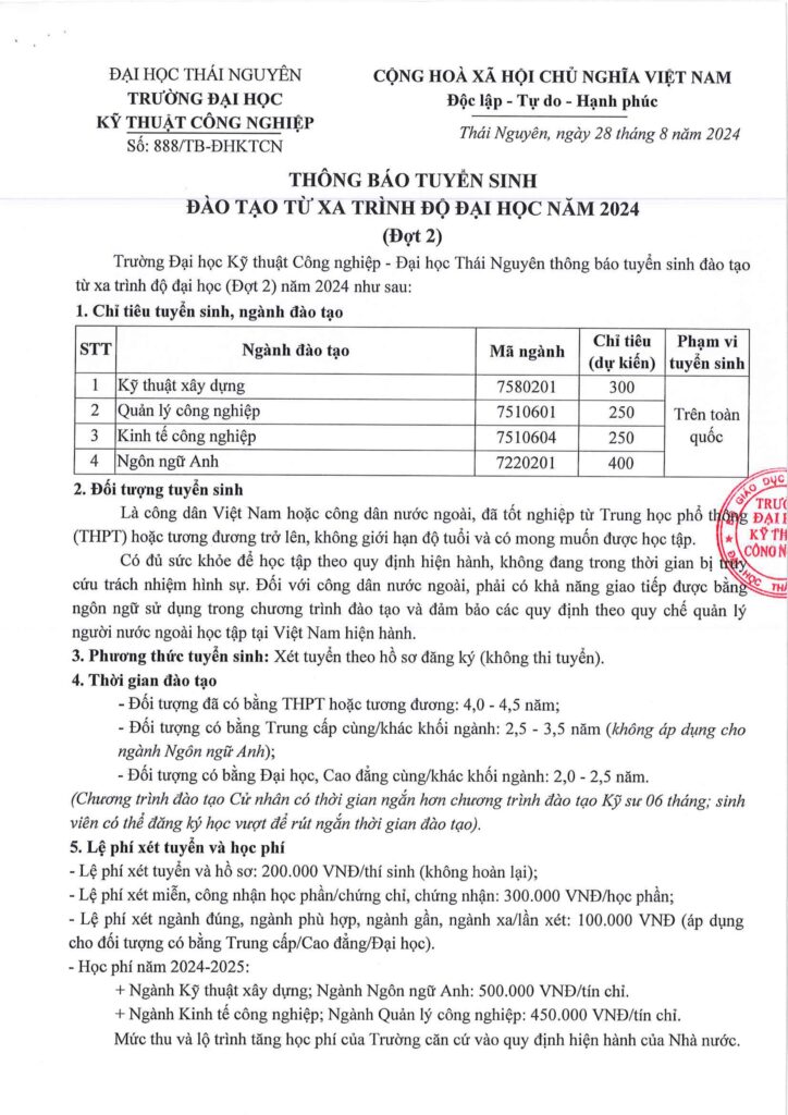 TRƯỜNG ĐẠI HỌC KỸ THUẬT CÔNG NGHIỆP TUYỂN SINH ĐÀO TẠO TỪ XA TRÌNH ĐỘ ĐẠI HỌC NĂM 2024 (ĐỢT 2)